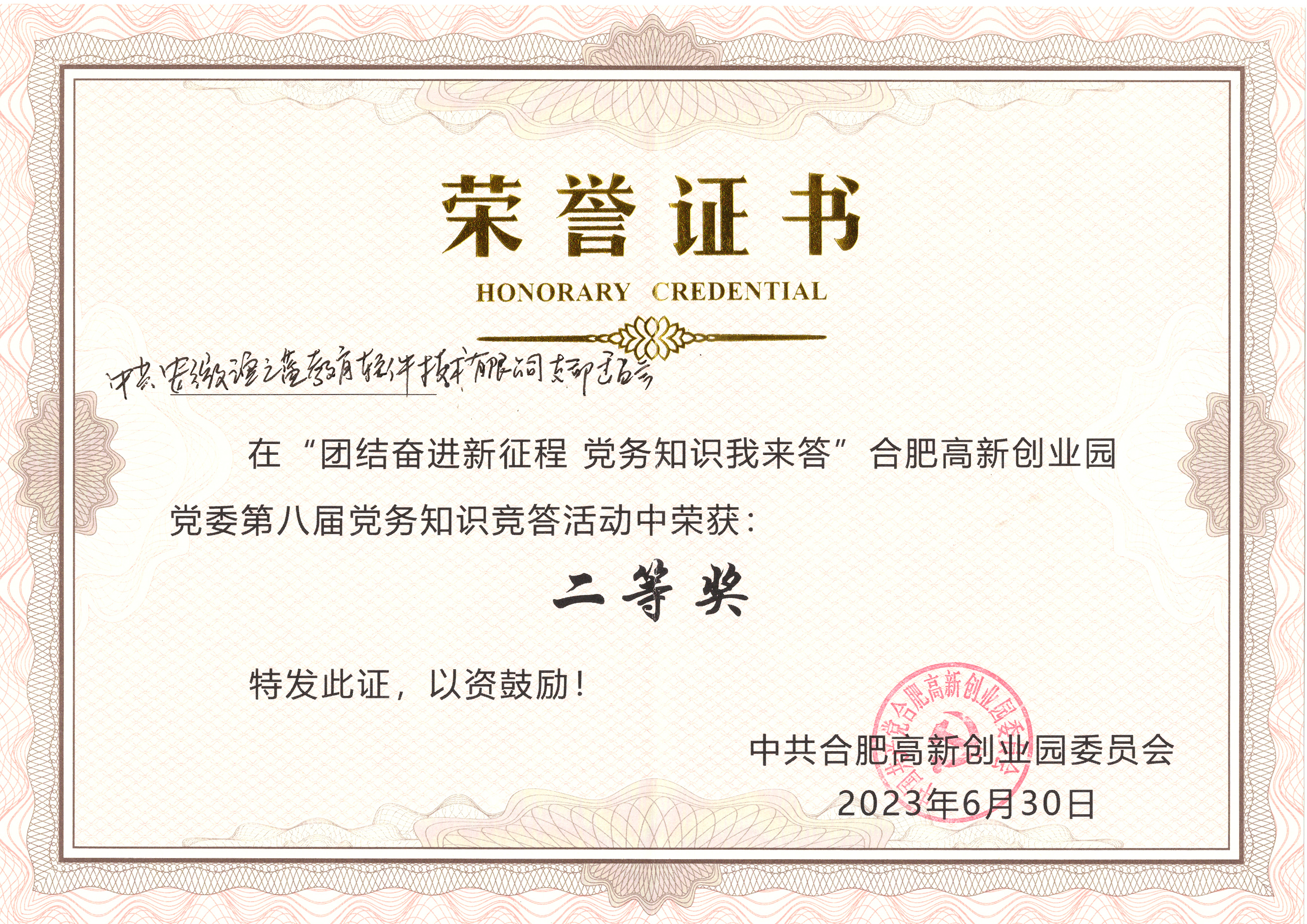 6月30日,合肥高新创业园党委开展第八届知识竞答活动,我司党支部参赛队伍荣获二等奖。