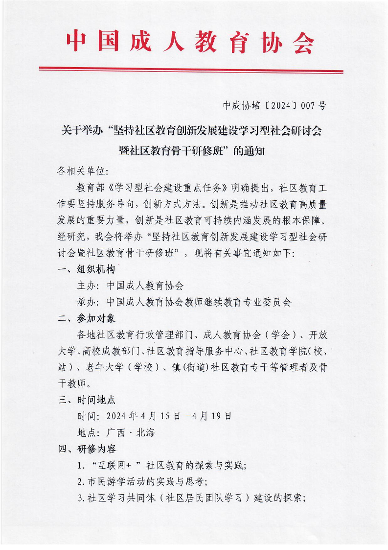 关于举办“坚持社区教育创新发展建设学习型社会研讨会暨社区教育骨干研修班”的通知
